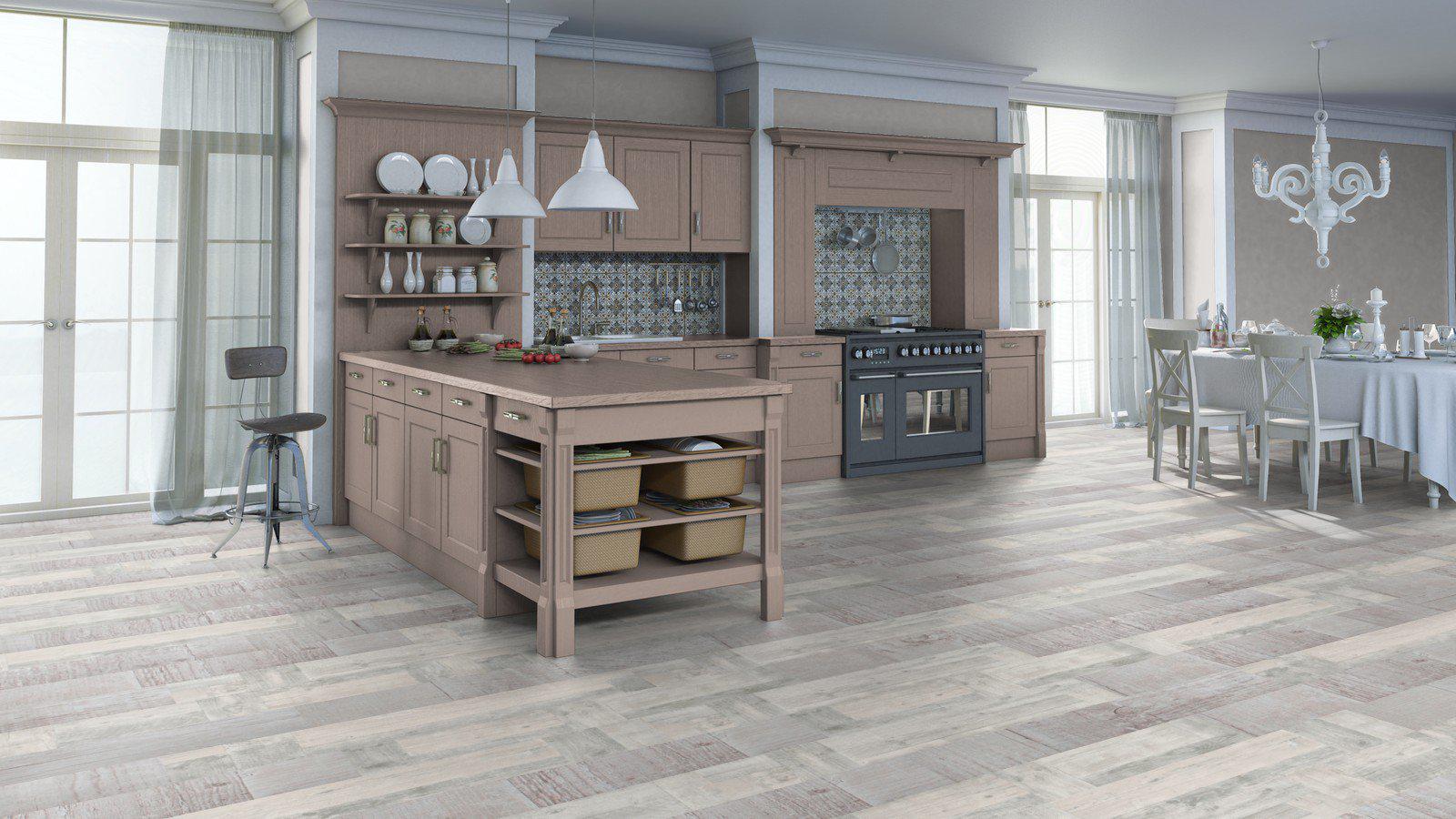 Влагостойкий ламинат под серый дуб наполнит кухню уютом